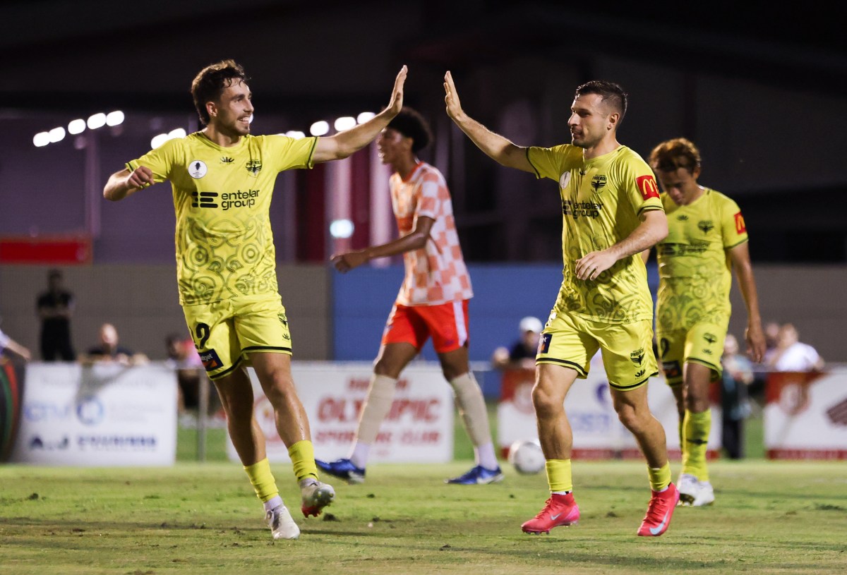 Gabriel Sloane-Rodrigues (left) and Luke Brooke-Smith (right) celebrate combining to set-up Kosta Barbarouses’ 39th minute goal. Photo: Football Australia.