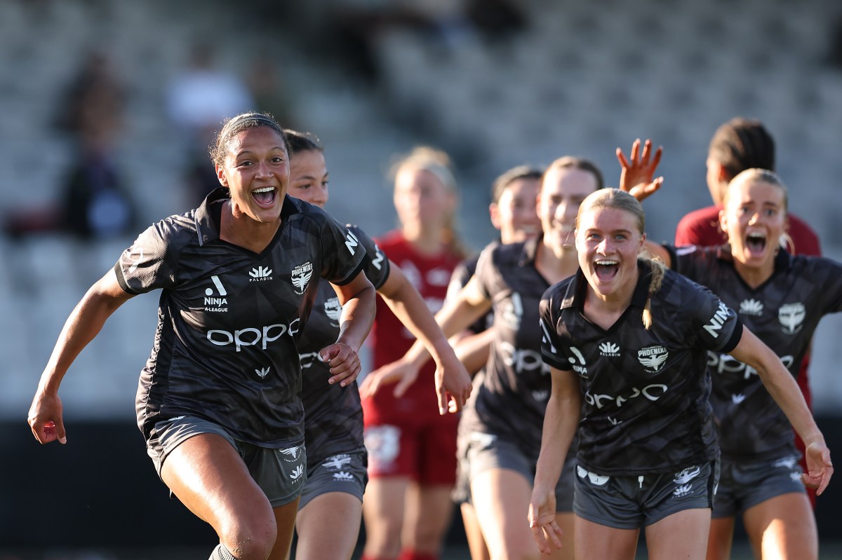 SYDNEY, AUSTRALIA – NOVEMBER 22: Maya McCutcheon of the Phoenix (L) celebrates scoring a goal during the round four A-League Women’s match between Adelaide United and Wellington Phoenix at Netstrata Jubilee Stadium on November 22, 2024 in Sydney, Australia. (Photo by Brendon Thorne/Getty Images)