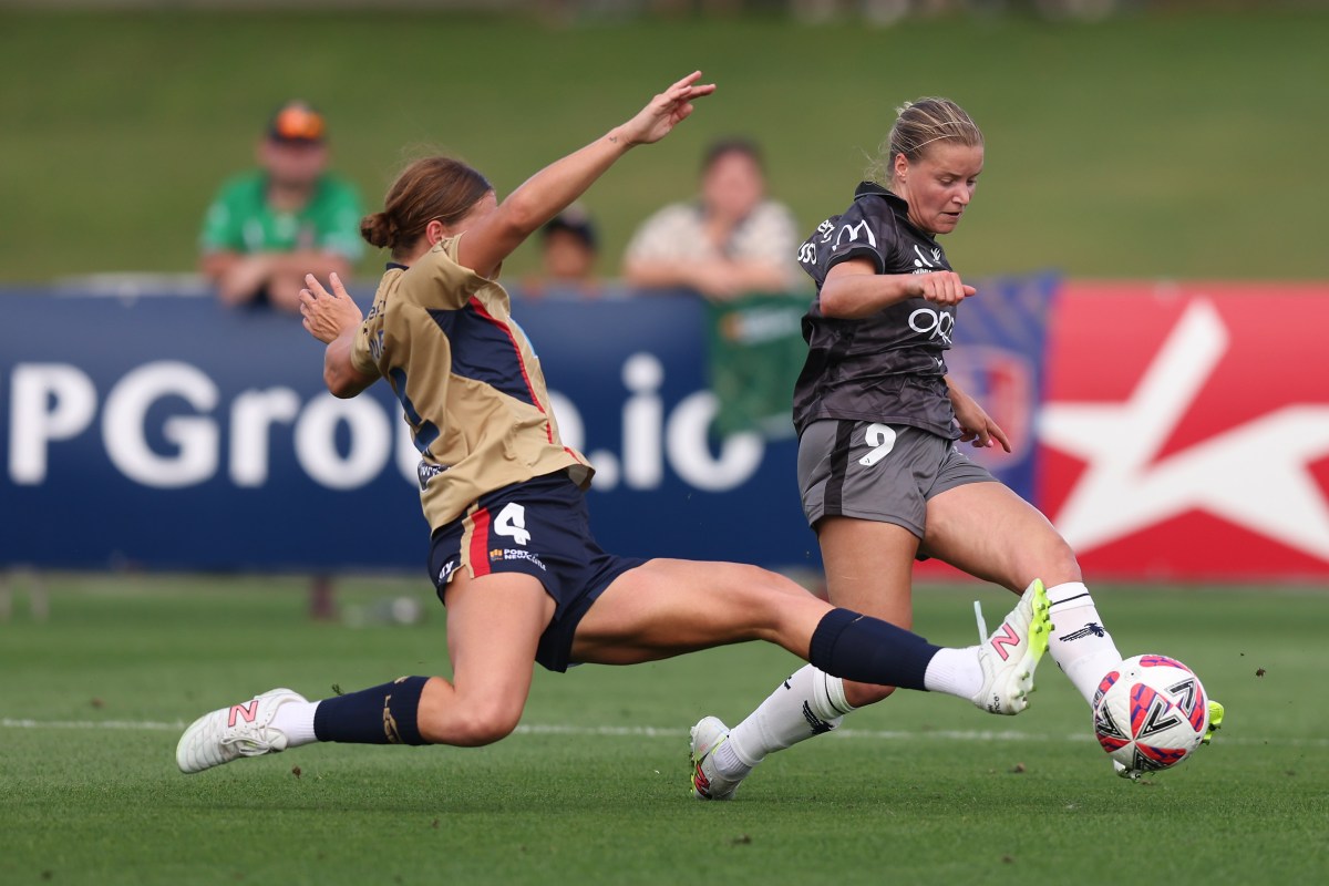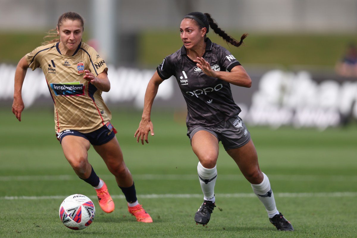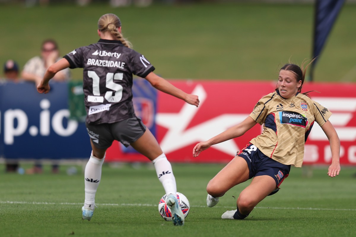 There was little goalmouth action before the first stoppage in play, with some last-ditch defending from Newcastle denying Phoenix forward Emma Main a shot on goal in the 10th minute when she was slipped into the Jets’ box by Alyssa Whinham.